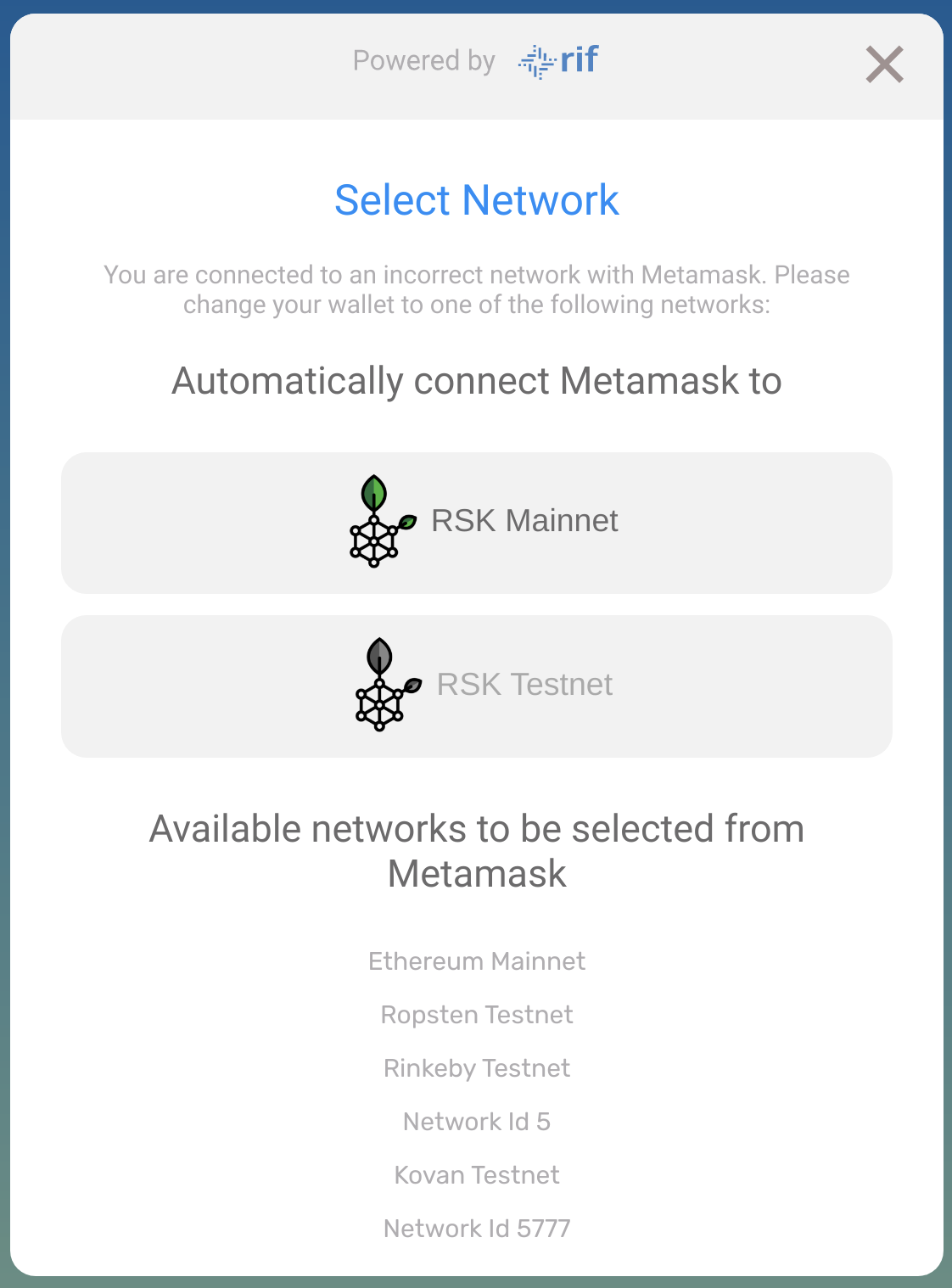 Alternatively, you can do this automatically, by visiting https://rif.technology/, and when you attempt to connect using MetaMask, you will get presented with the following: