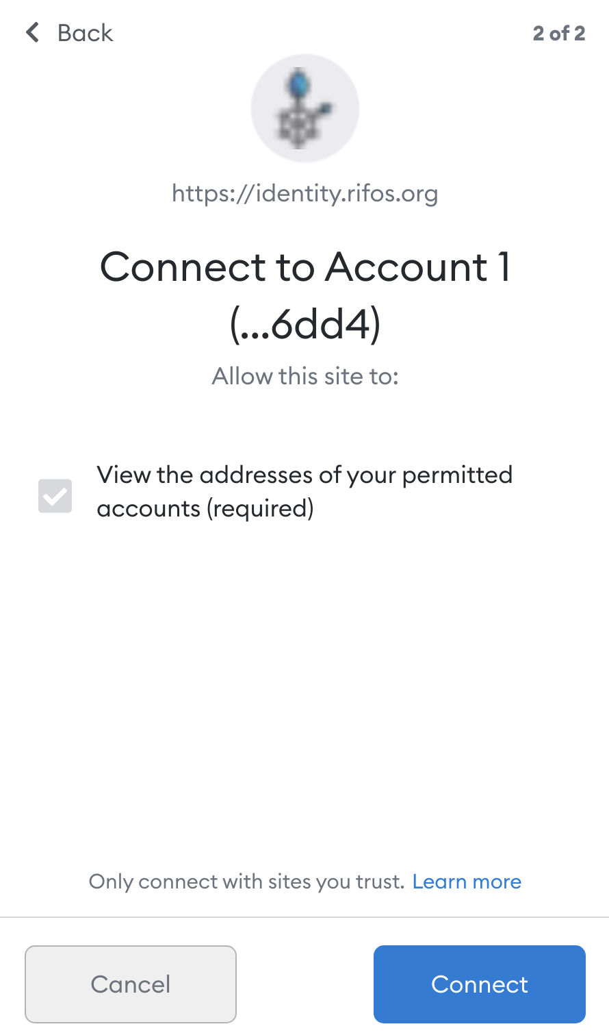 MetaMask will then show another popup, asking you whether you want to allow RIF Identity Manager to see your account addresses.